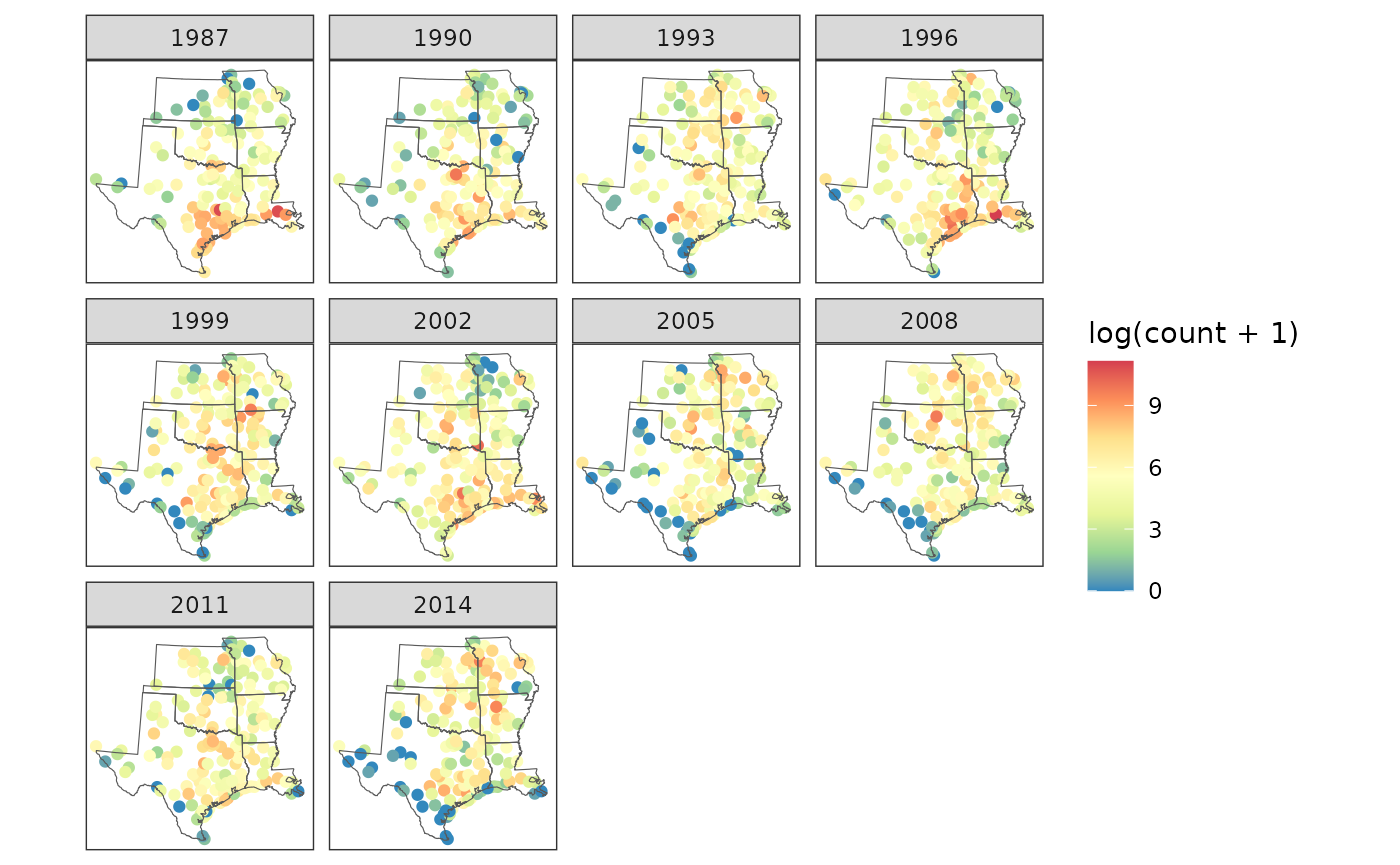 sf::st_make_valid()Next we import some bird count data from the GitHub repository associated with Meehan et al. (2019), and turn the data set into spatially referenced points. We use a subset of the data (30 years, 6 US states) for this analysis to reduce computing time (~ 1 min). Note that site selection and zero filling, important components of trend analyses, have already been conducted and this is the resulting data set.