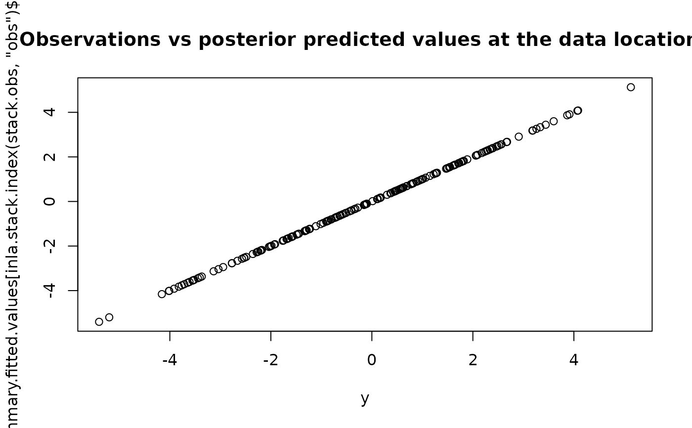 plot(y, result1$summary.fitted.values[inla.stack.index(stack.obs, "obs")$data, "mean"],